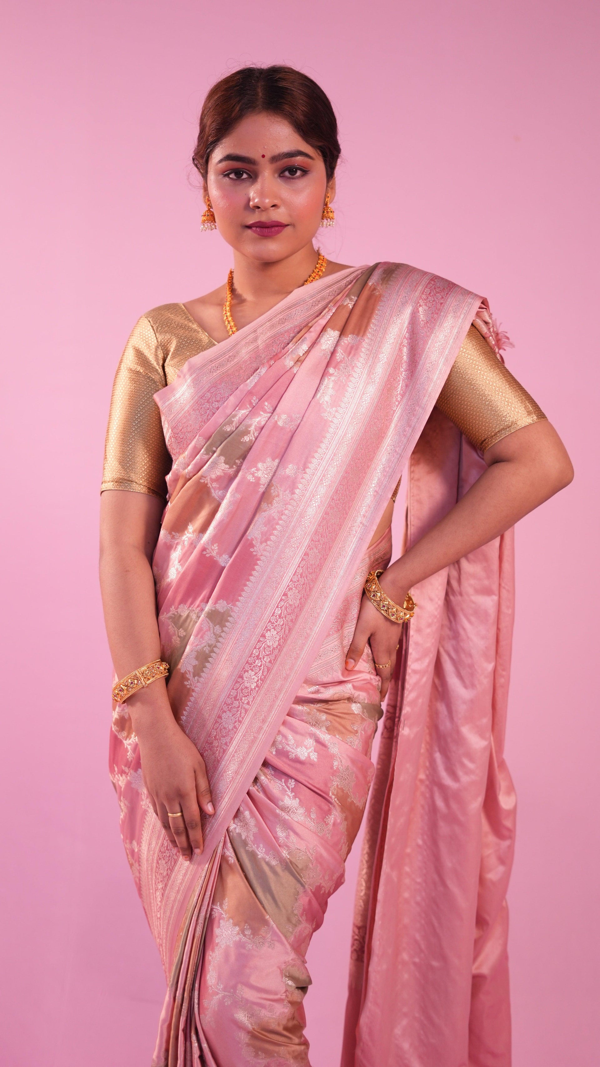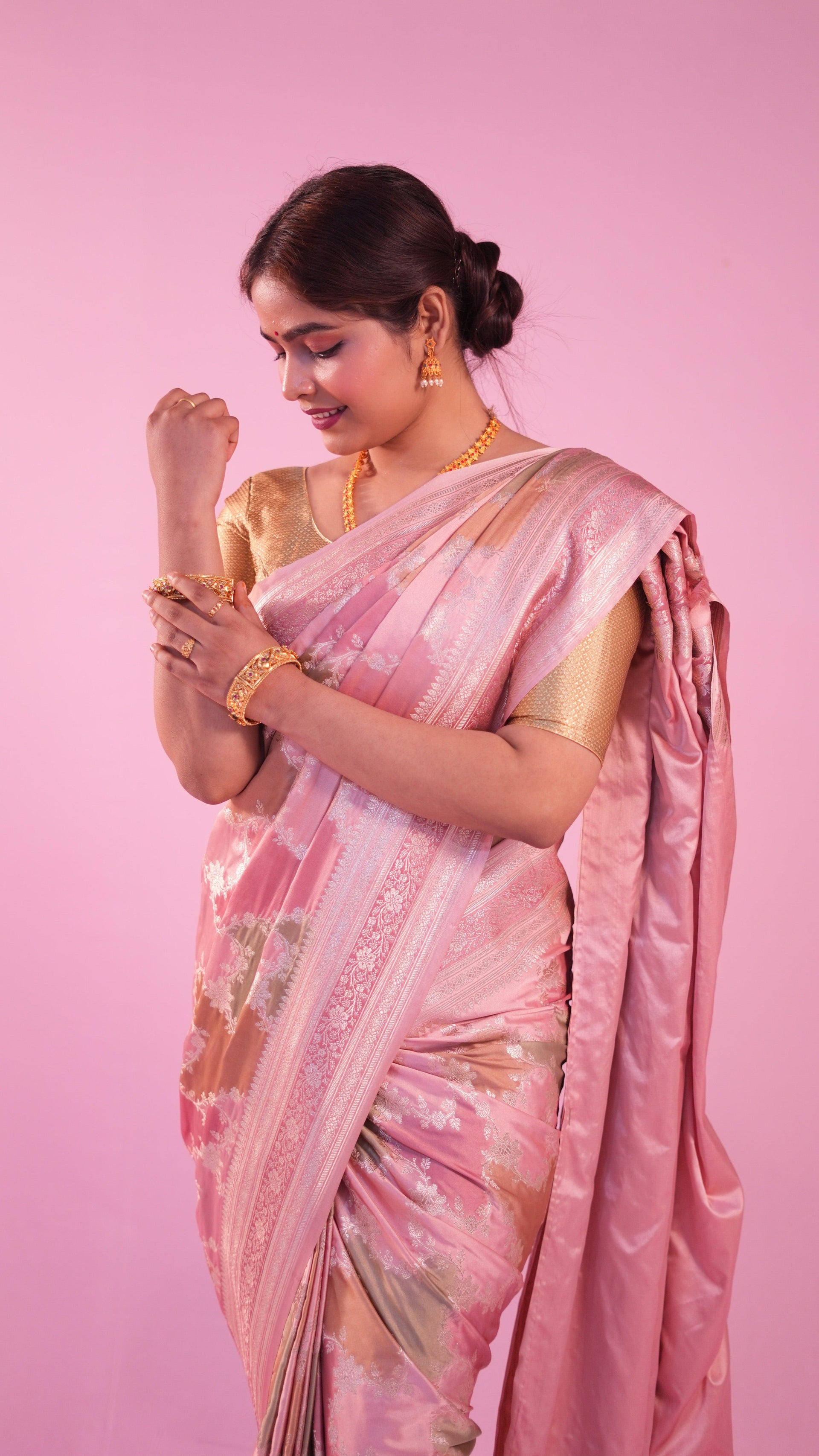 Expertly crafted, this Banarasi Rang Kart Saree in candy pink is made from the finest malmal mashru silk. With a unique rangkart design and intricate light copper Zari work, this saree exudes elegance and charm. The matching blouse features hand-woven Zari sleeves, adding to its appeal. Get it now for 7100/- and elevate your ethnic wardrobe.