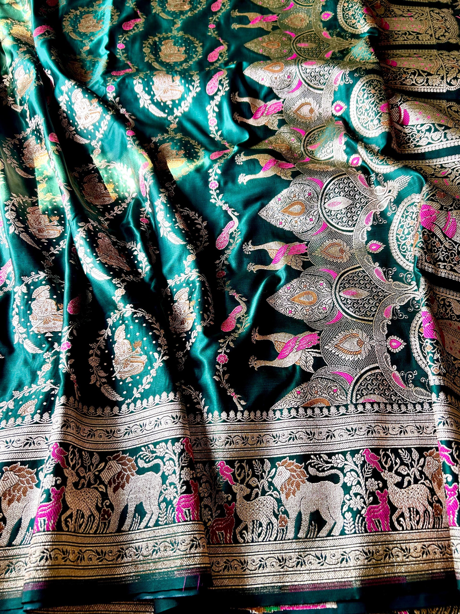 Bottle Green Sikargah Satin Katan Silk Saree – Regal Banarasi Weave with Heritage Elegance