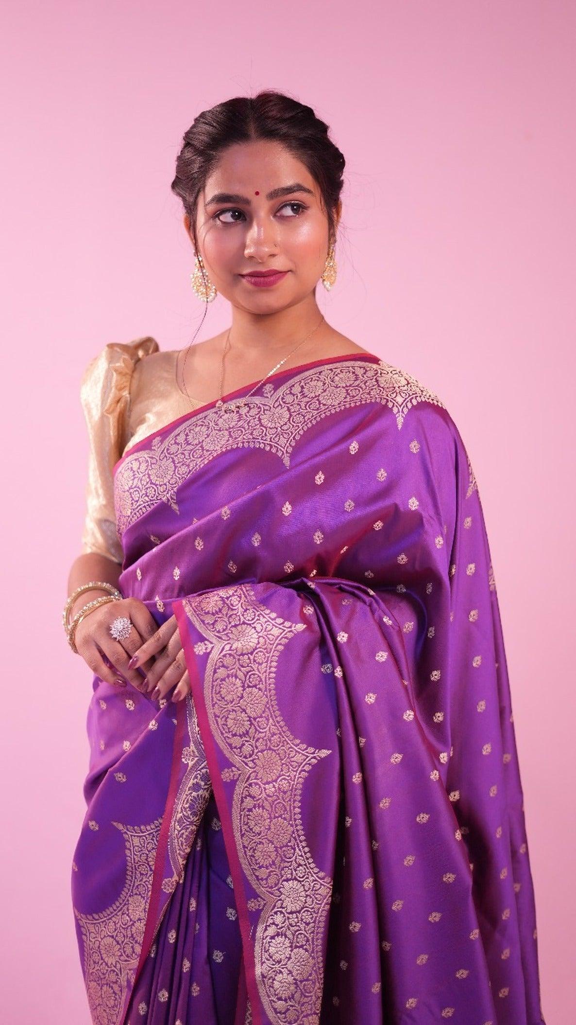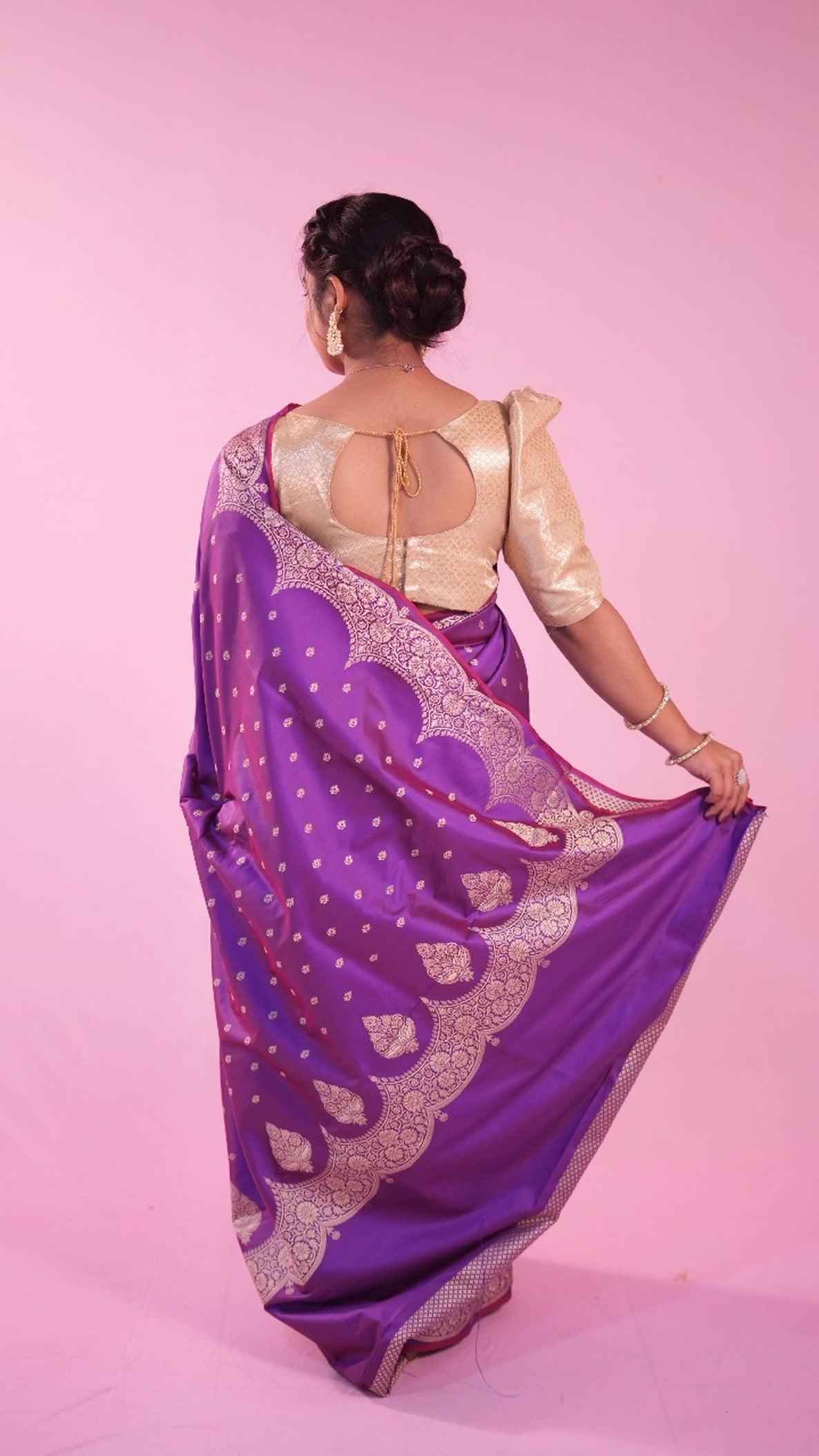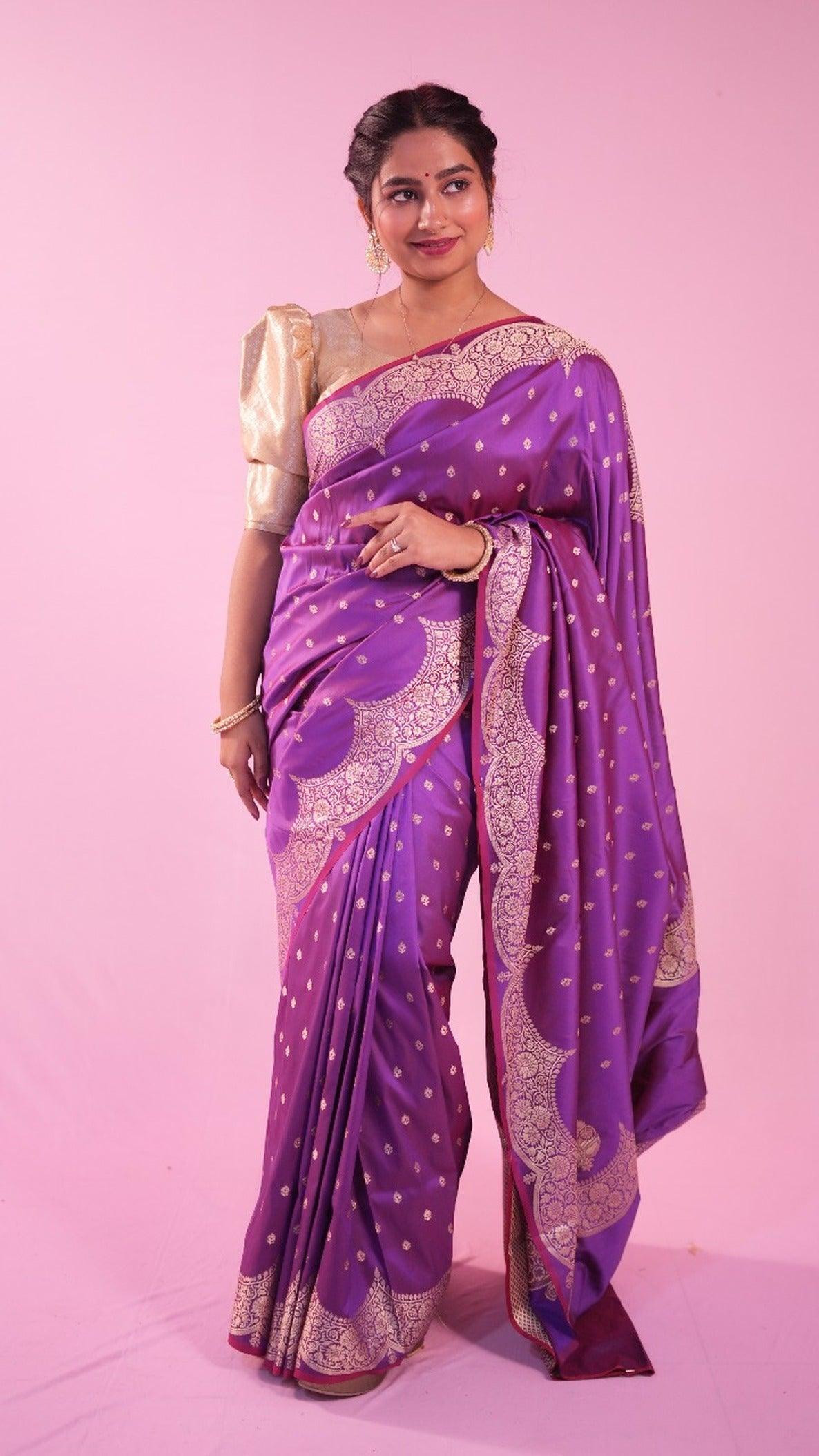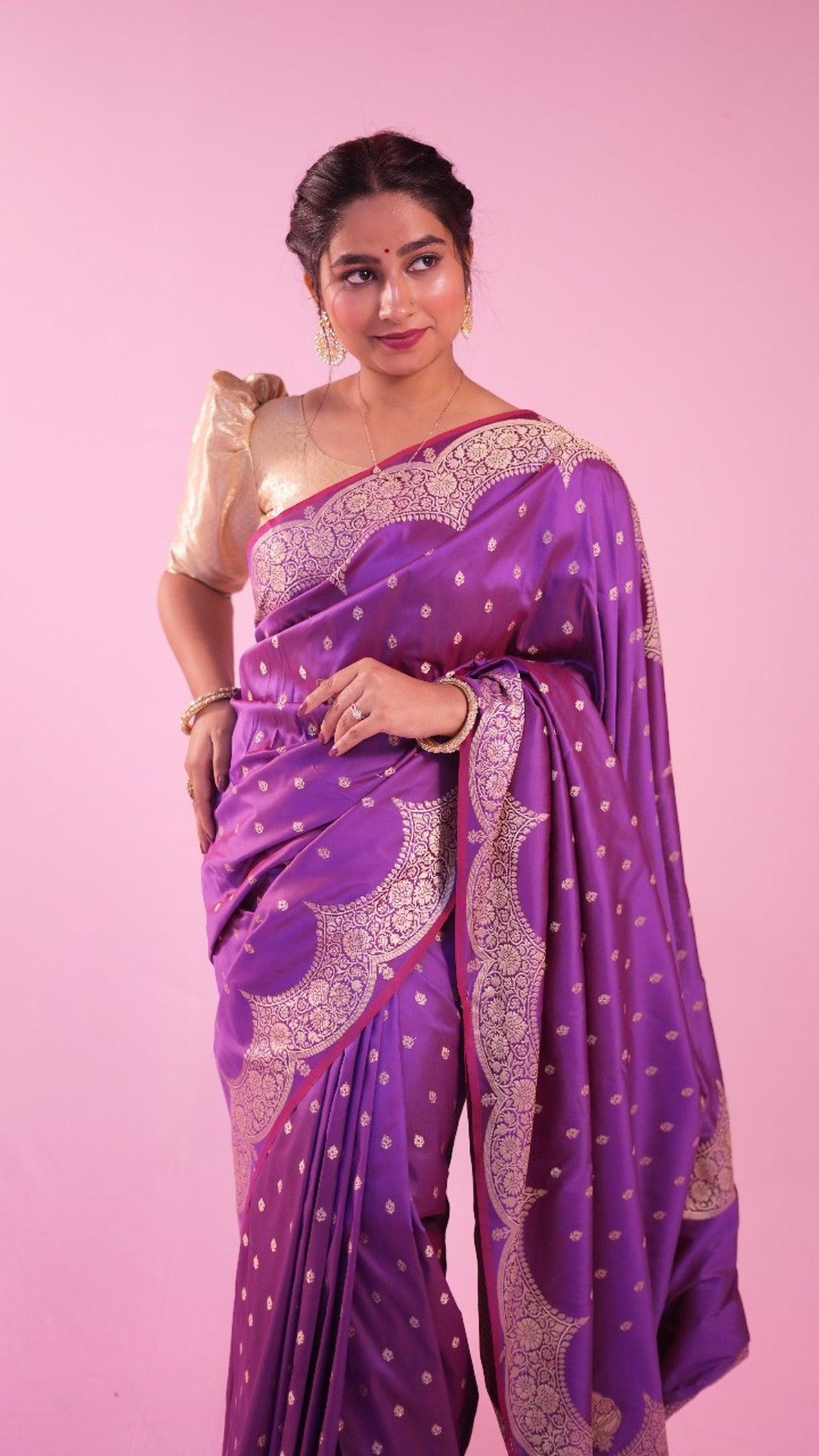 Fabric- Semi Katan Design- Scalp Border With Fancy ButtiSaree colour- Purple Blouse colour- Purple Blouse design - brocade blouse Saree length 5.5mBlouse length- 0.8-1mSaree width-45inch