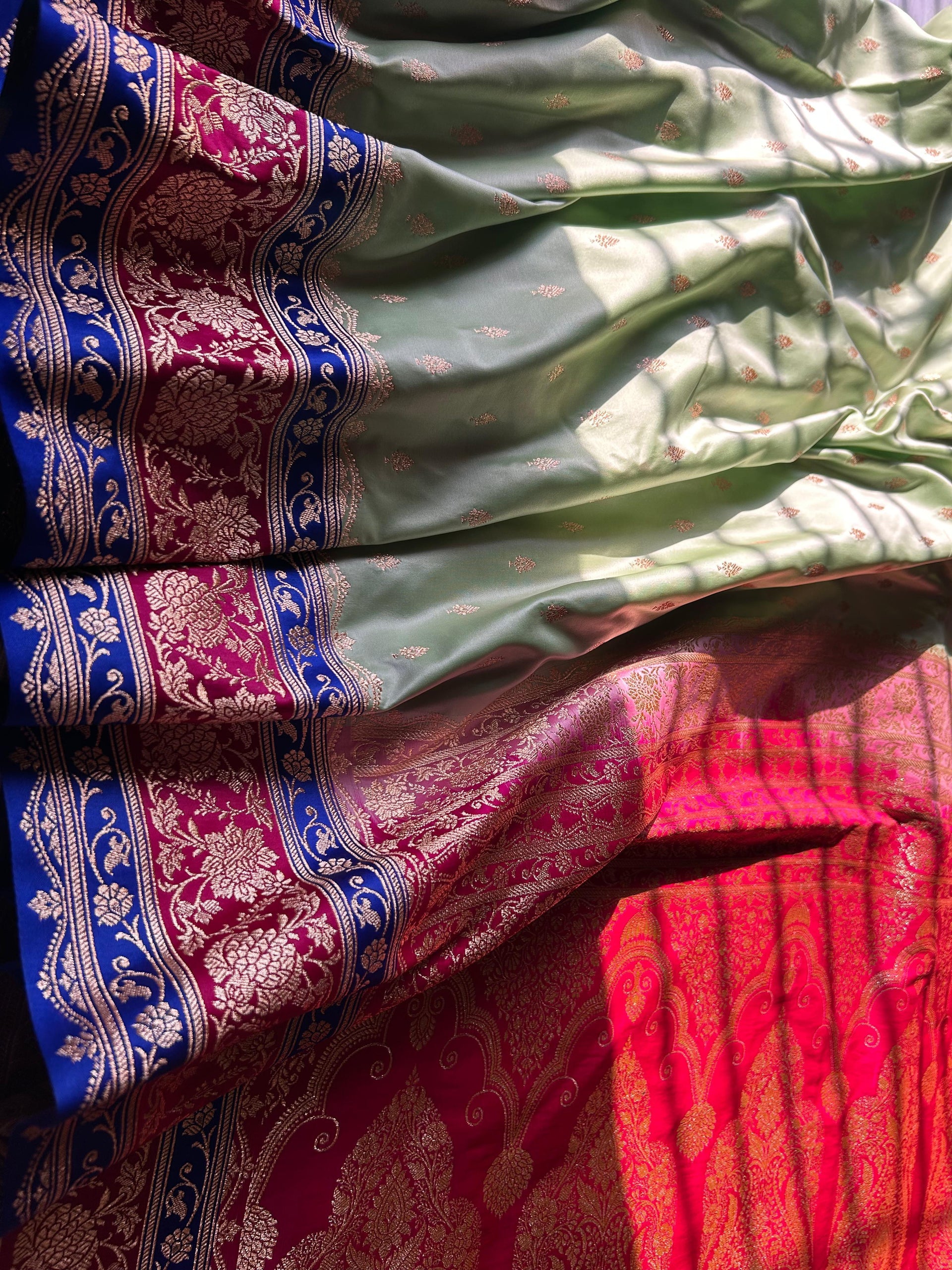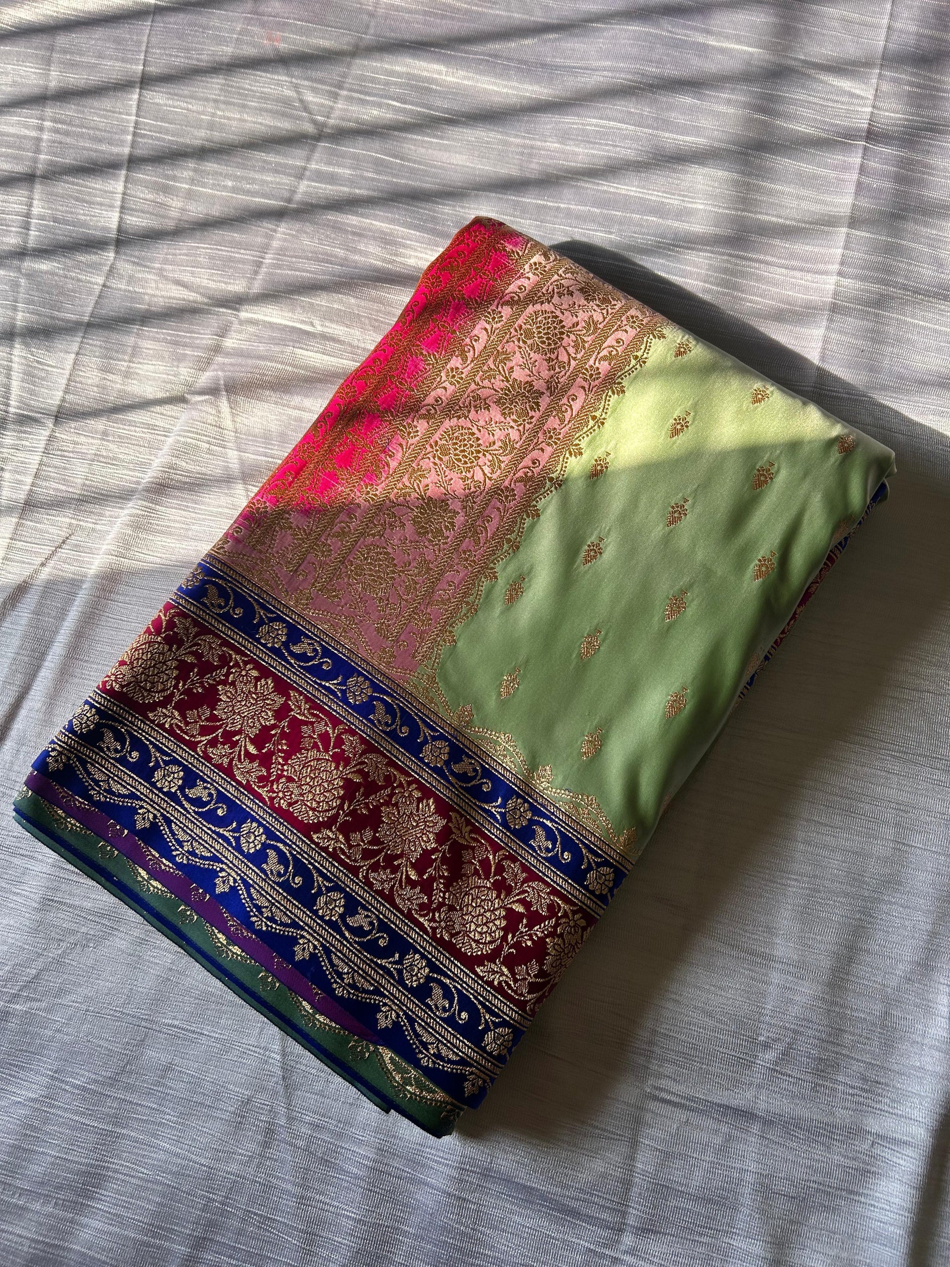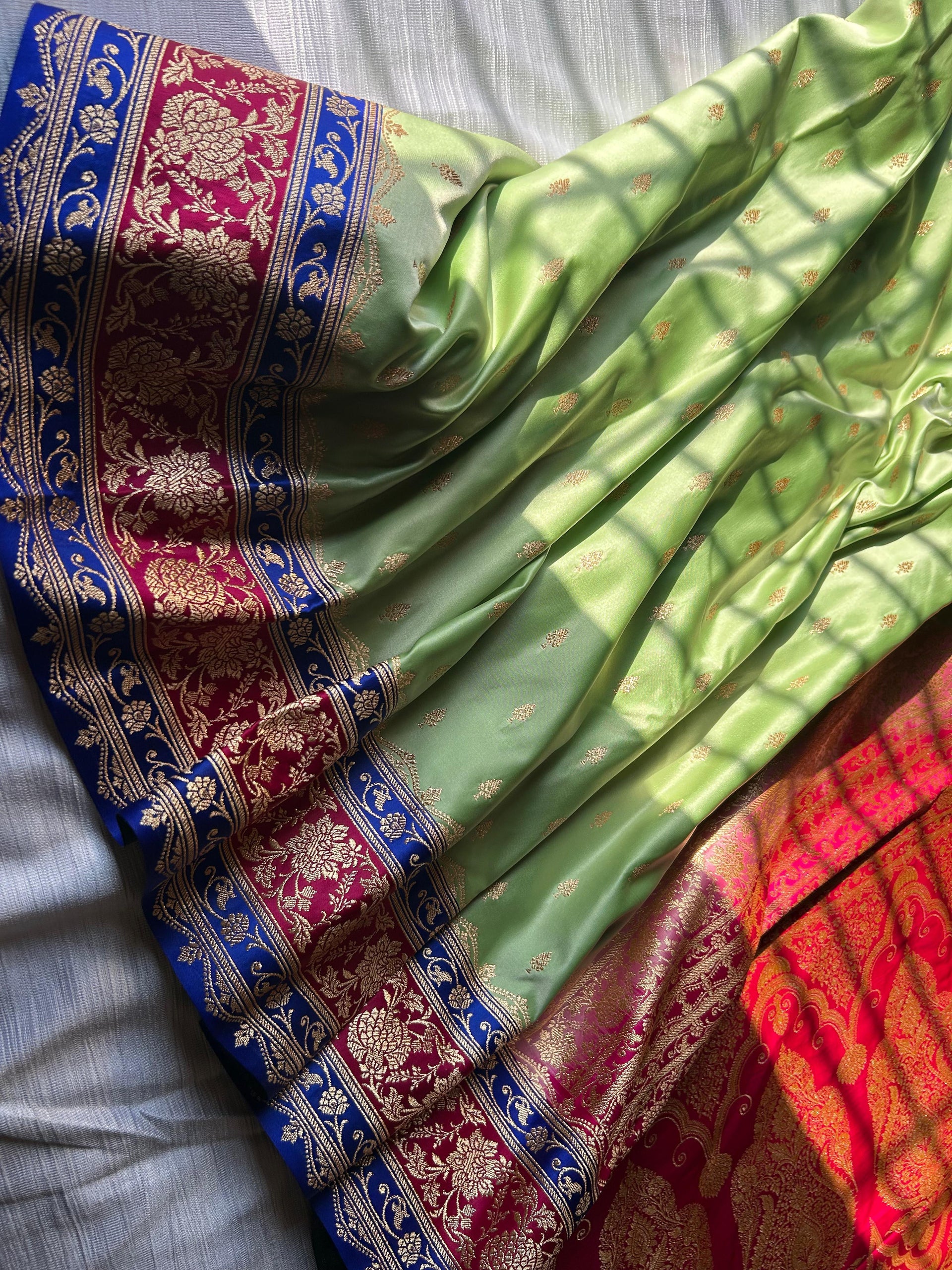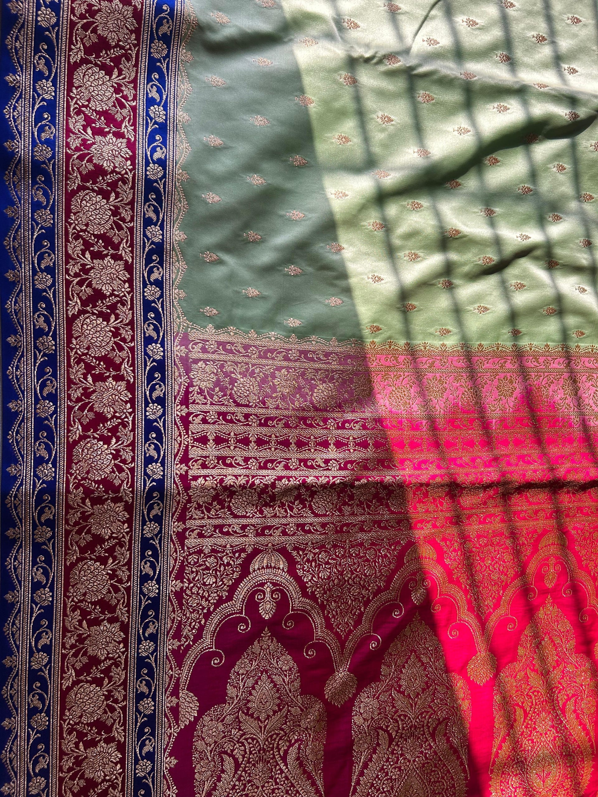 3D Dye Parrot Green Katan Silk Saree – Traditional Buti with Golden Pink Blouse