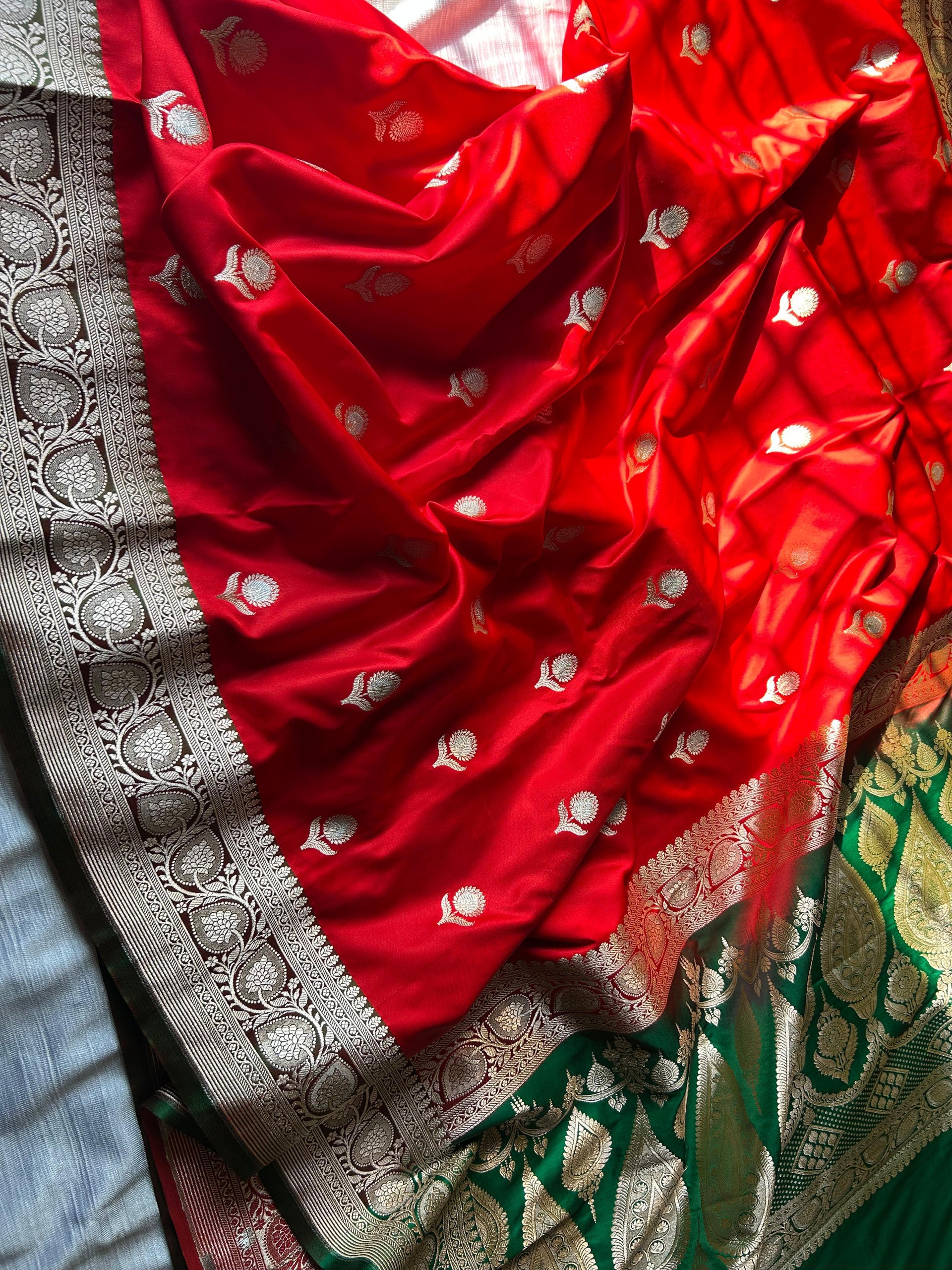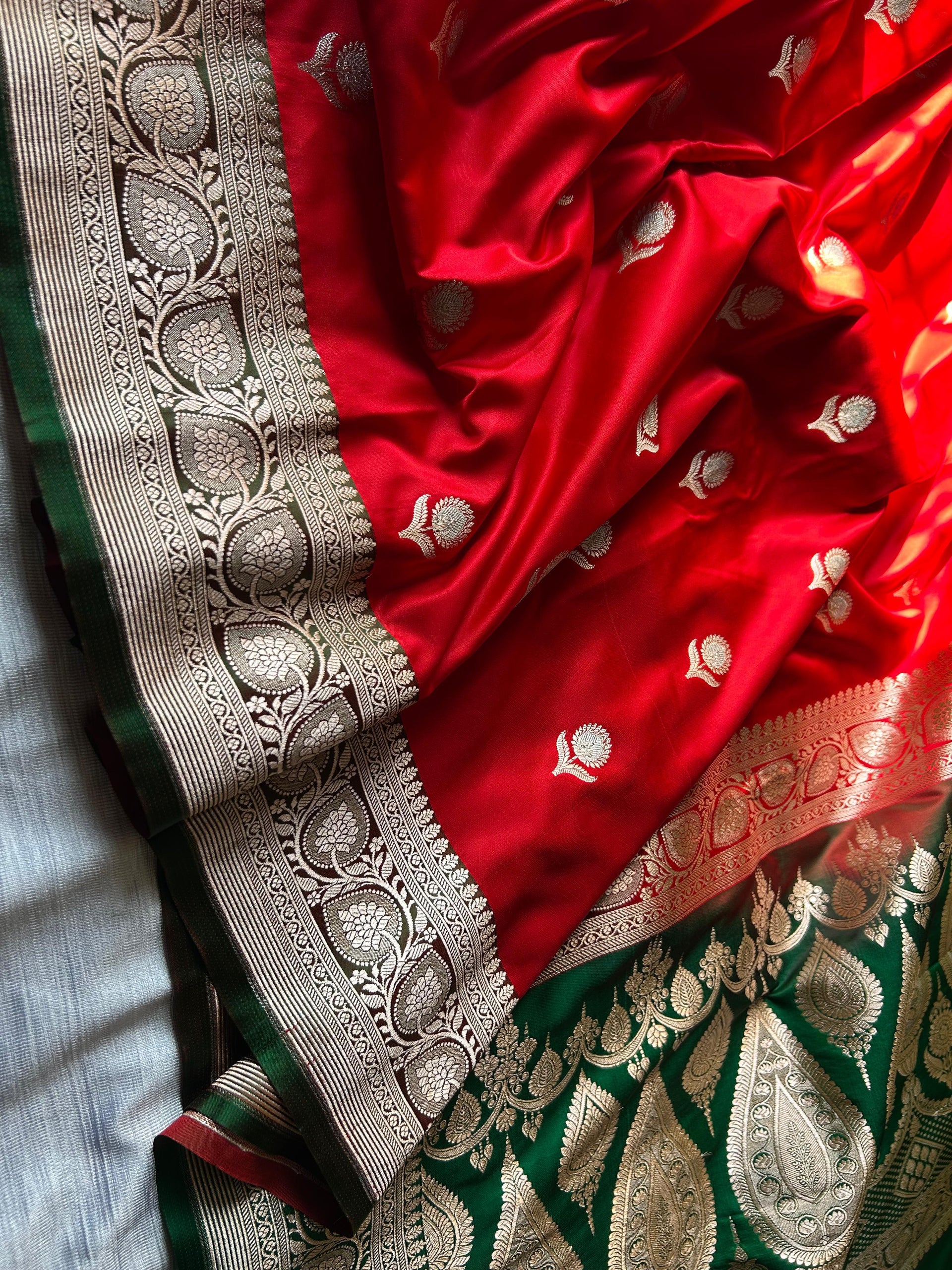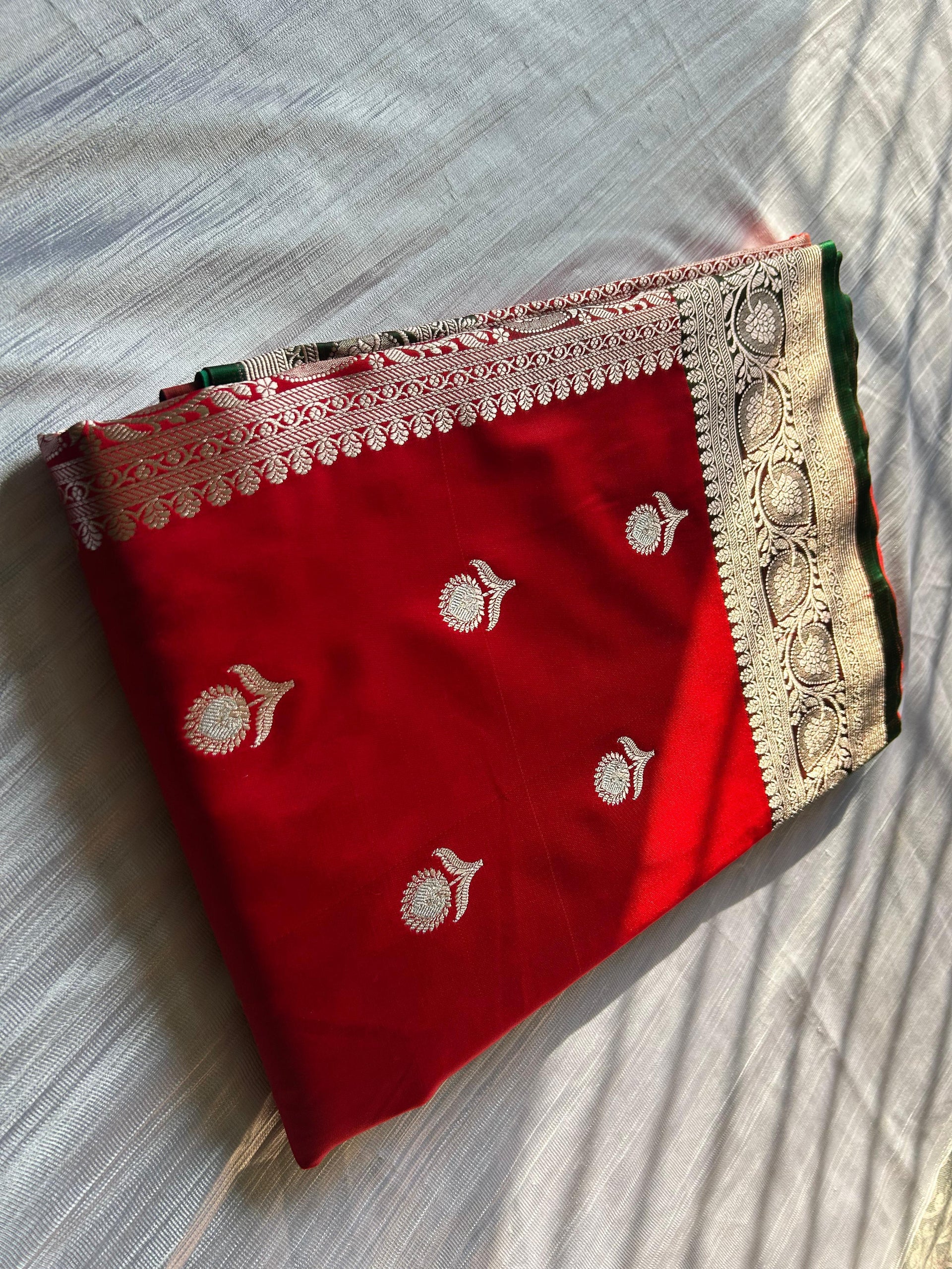 The saree features the exquisite Angel Rupa Sona Butti design, intricately woven with light copper zari that adds a subtle shimmer to the bold red fabric. It is paired with a contrasting green blouse piece, perfectly balancing tradition with a modern touch.