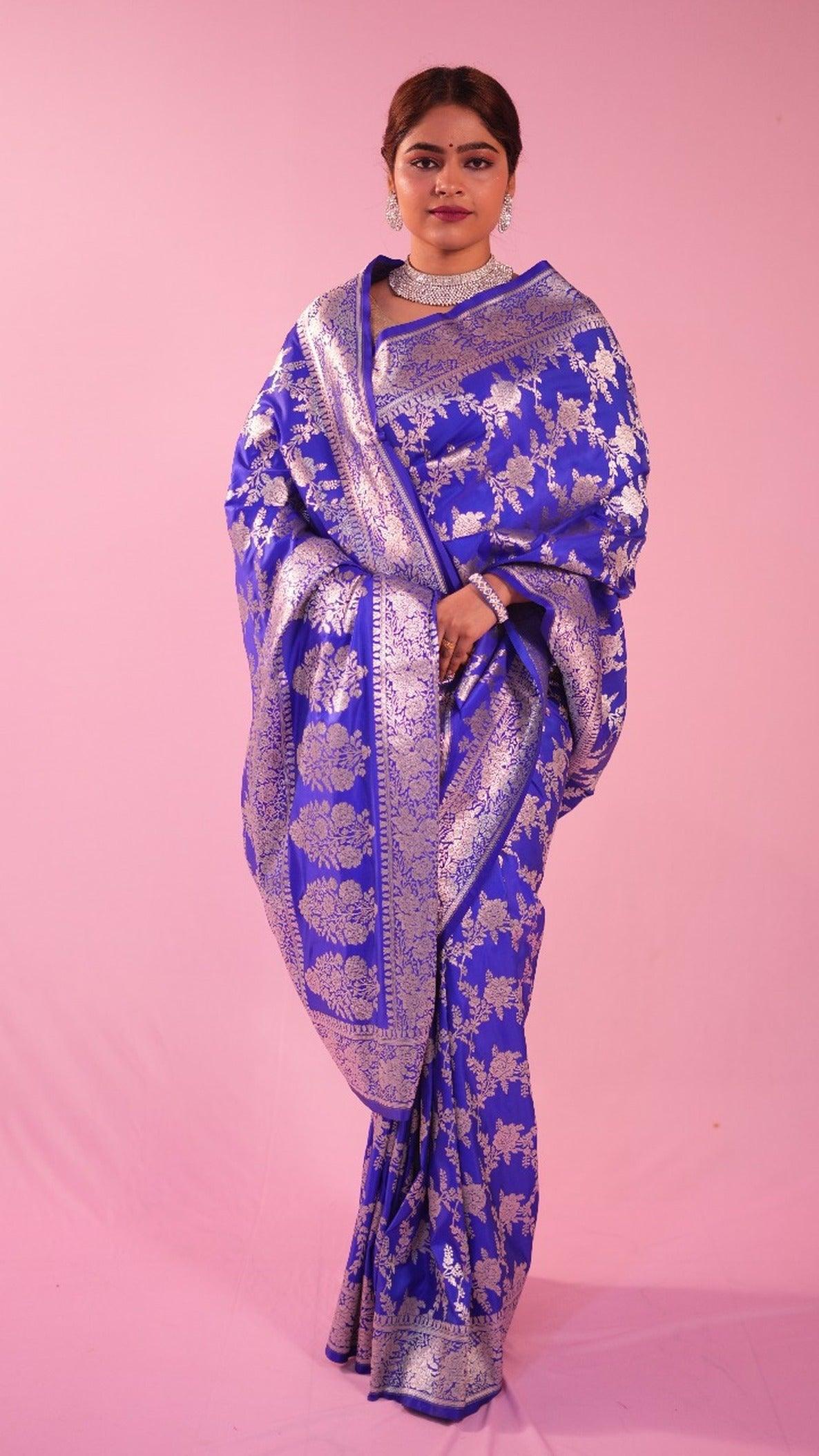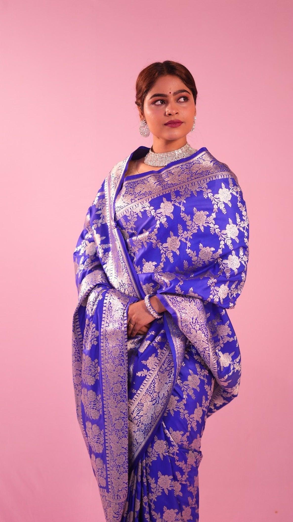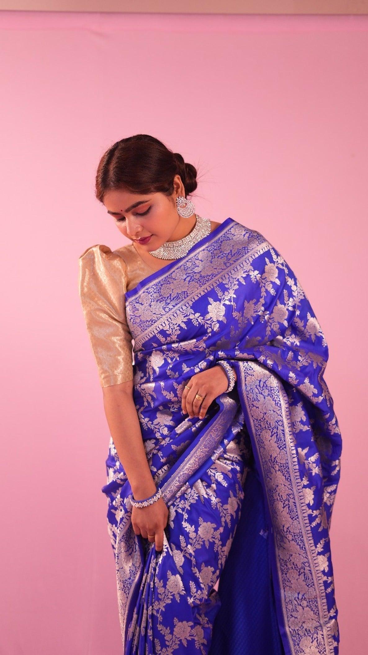 Fabric- Mashru Silk Malmal Silk Design- Persian Jal Saree colour- Royal Blue Blouse colour- Royal Blue Zari colour- Light Golden Saree length 5.5m Blouse length- 0.8-1m Saree Width- 45inch