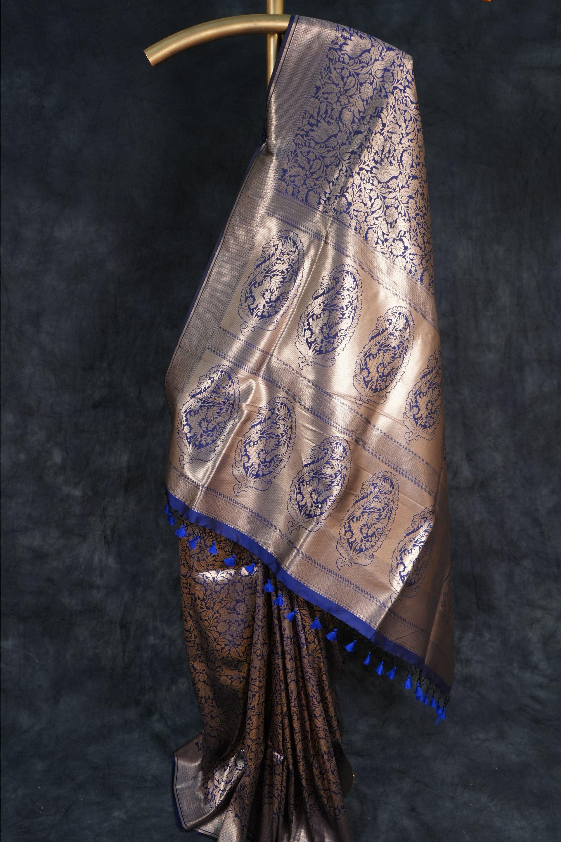 Dark Blue Shikargah Handwoven Pure Katan Silk Saree with Light Golden Zari – Traditional Heritage Weave
