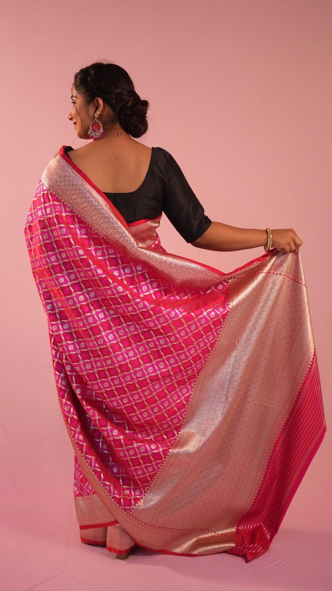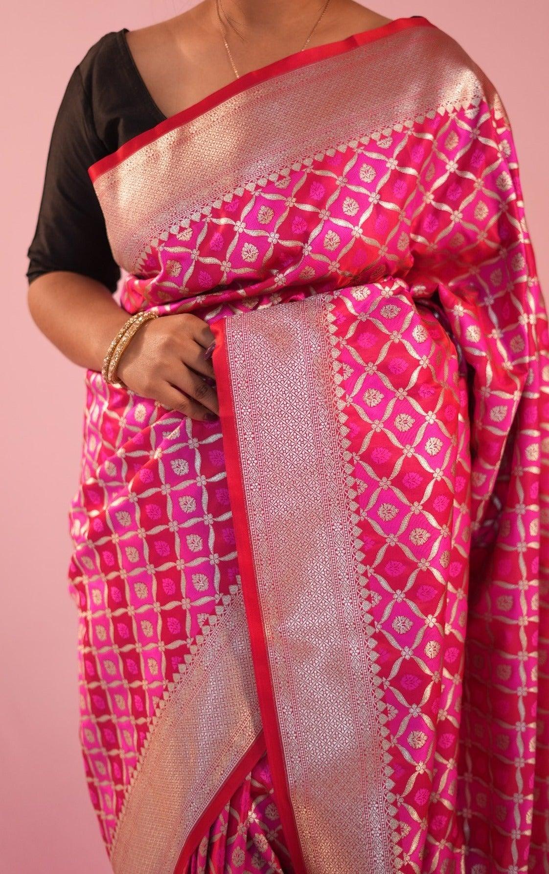 Fabric-mashru silk Design- rangkart Saree colour- hot pink Blouse colour- hot Pink Blouse design - designer blouse Zari colour- light golden Saree length 5.5mBlouse length- 0.8-1mSaree width 45inch