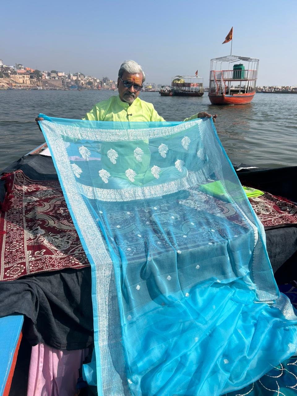 Bring home elegance with this Ice Blue 100% Pure Khadi Georgette Saree — a lightweight, handcrafted masterpiece made for sophisticated tastes.