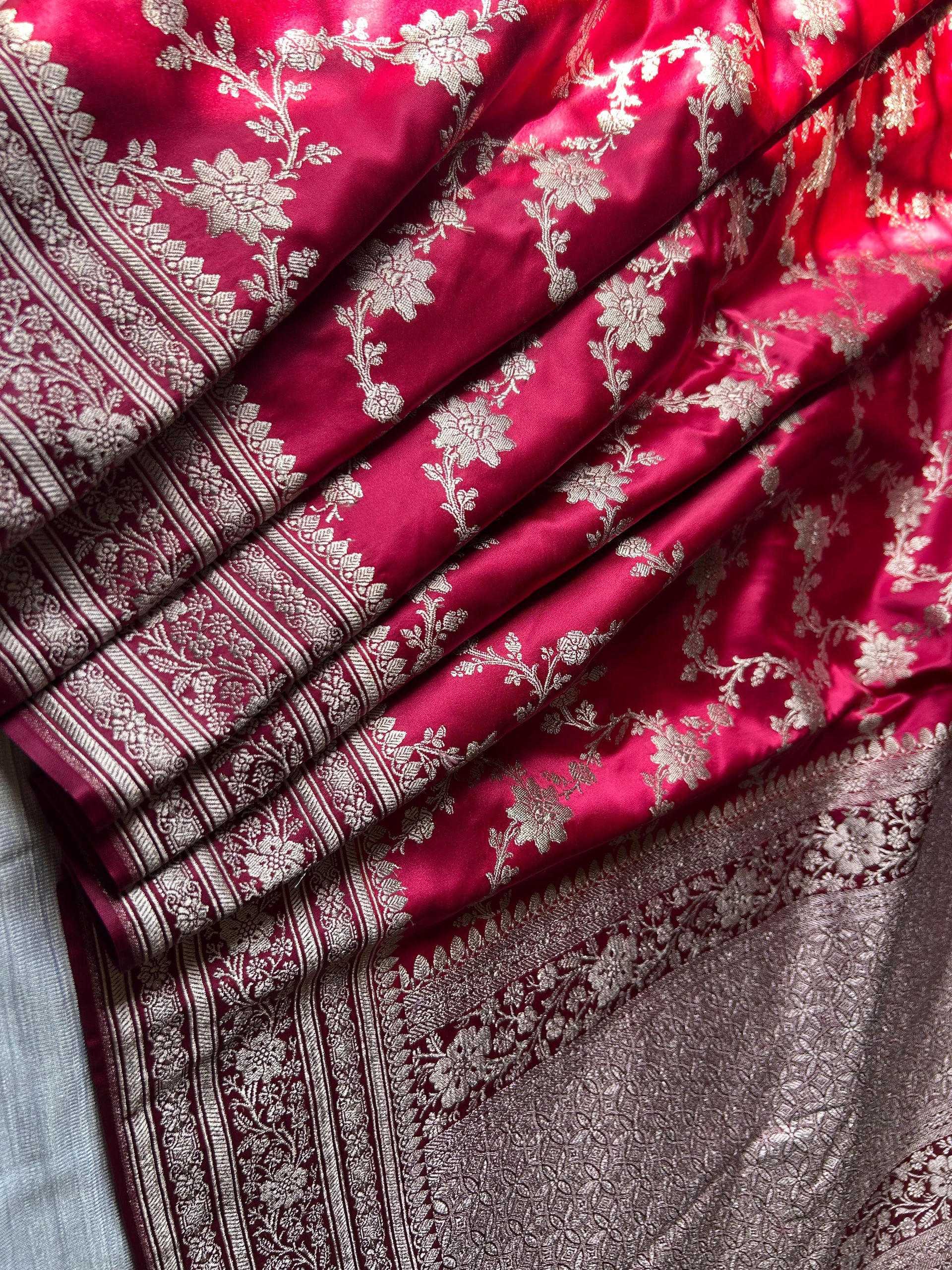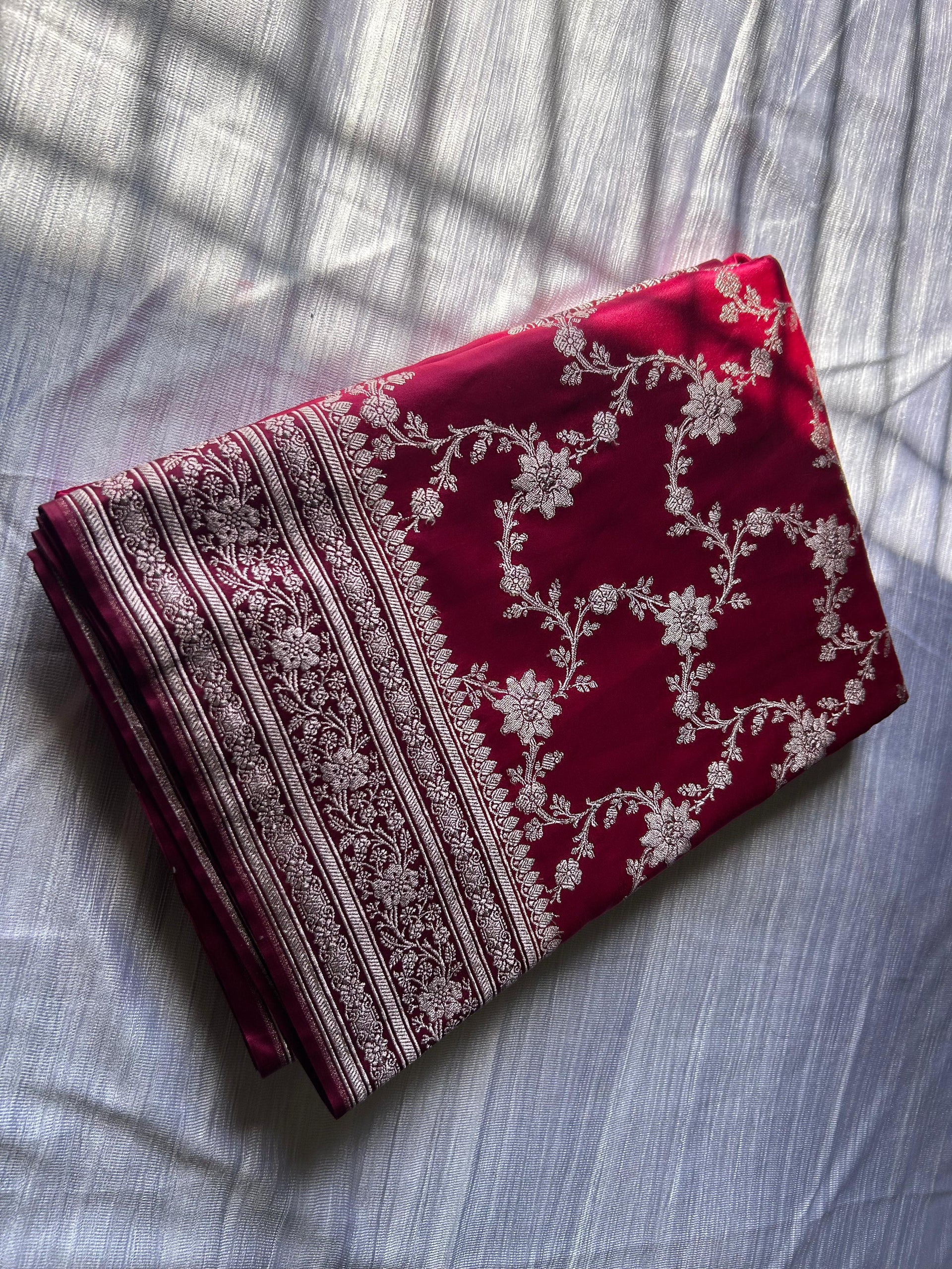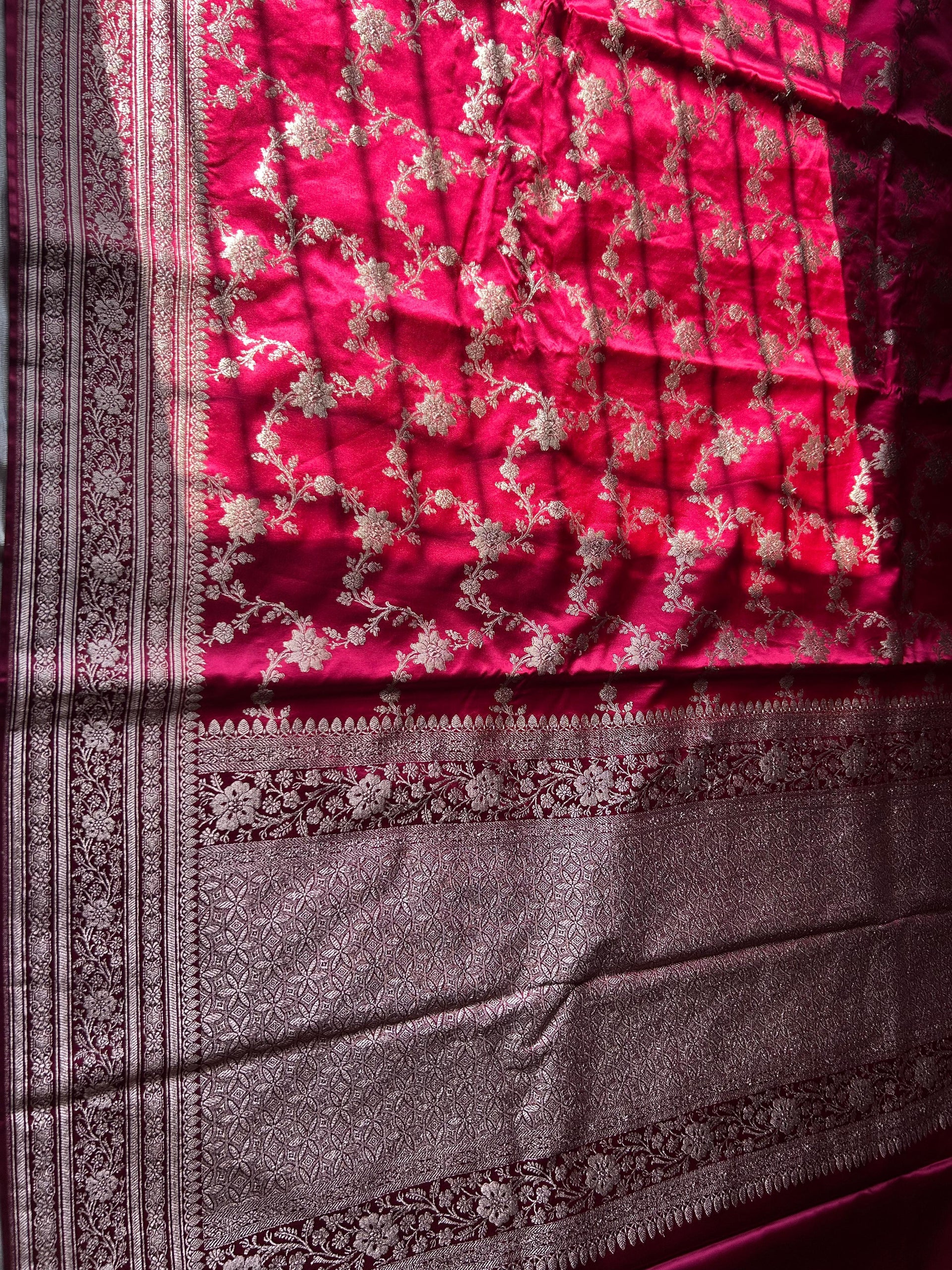 The saree features a striking rani pink body, contrasted with intricate jalebi-style jaal work in majenta pink for a bold, artistic effect. Paired with a matching majenta pink blouse, and finished with soft light golden zari, this saree is a statement in color and craft.