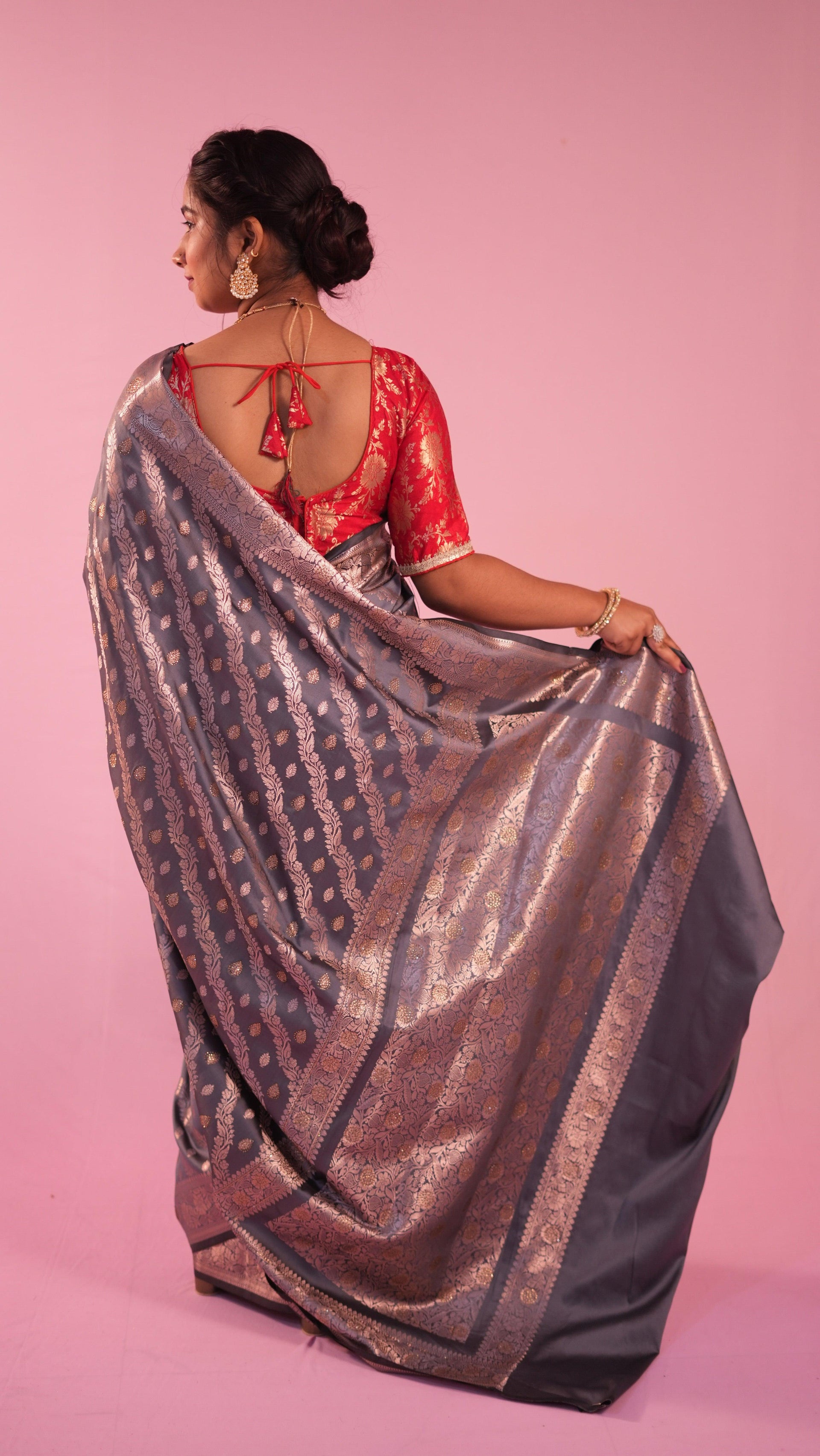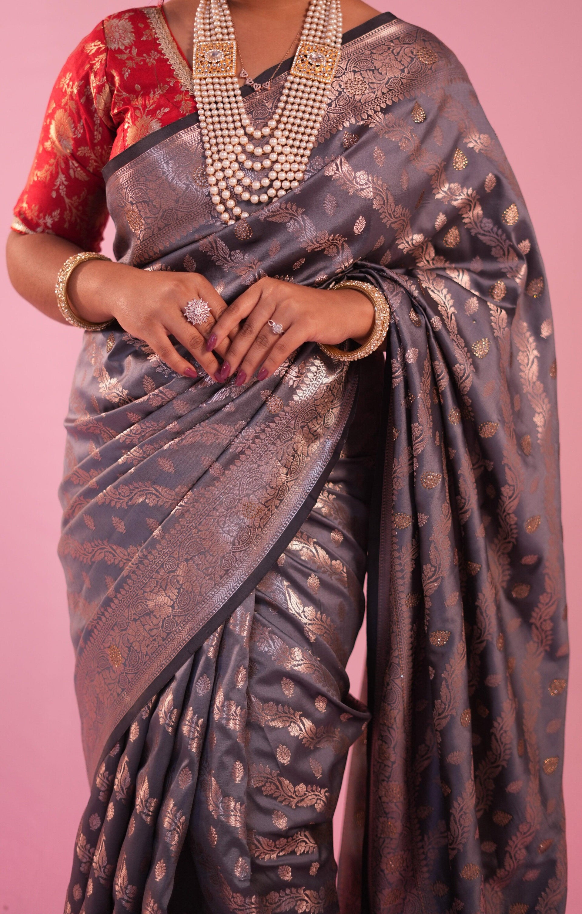 Discover the elegance of our Semi Katan Aada Butti Saree. Made with high-quality semi katan fabric, this saree features a beautiful aada butti design in a dark grey color. The brocade zari woven golden blouse complements the saree perfectly. With a length of 5.5m and width of 45 inches, this saree offers a comfortable and flattering fit. Get yours for only 1699/-.